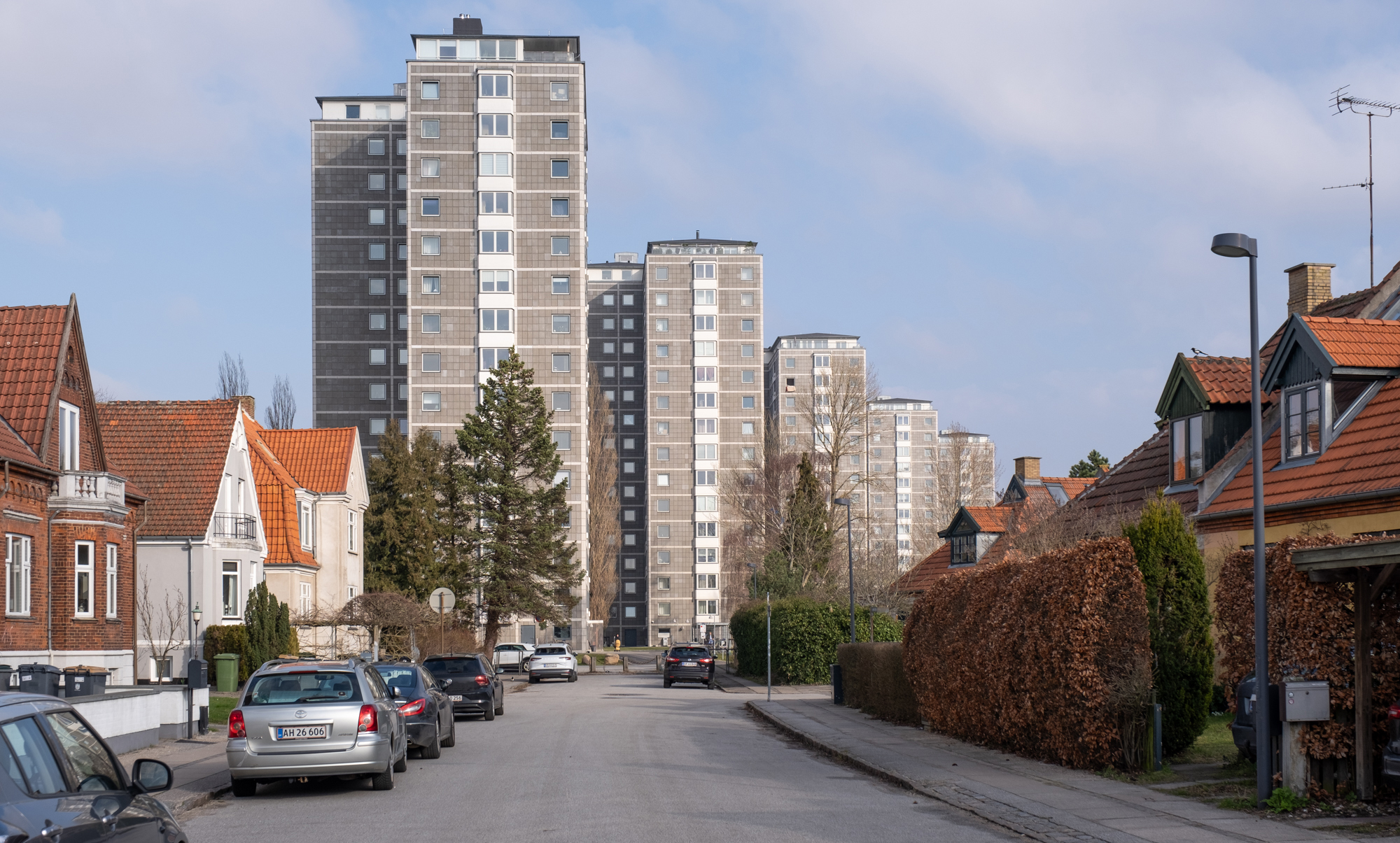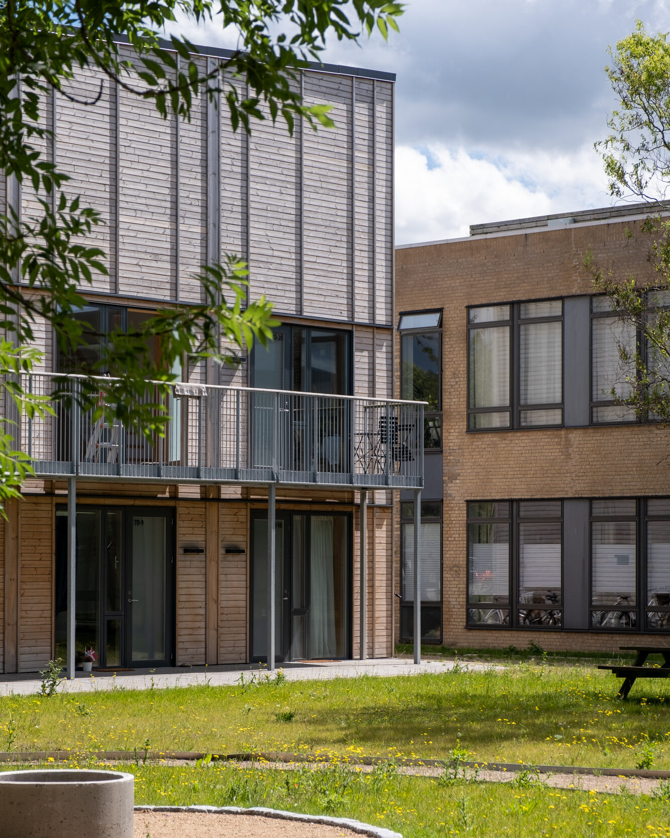 Udvikling af almene ungdomsboliger i Universitetsparken, Roskilde. Transformation af eksisterende kontorbygning og opførelse af tre nye bygninger med træelementfacader.