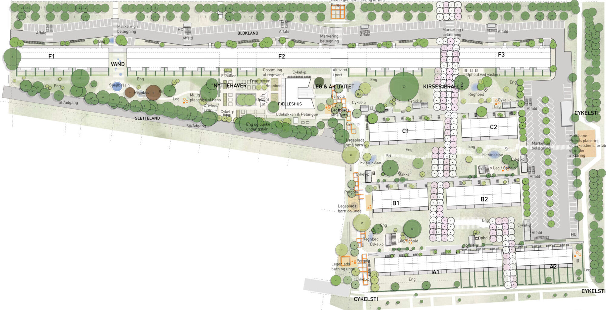 Udearealerne opgraderes med etablering af nye strøgforbindelser og nytænkning af hele haveanlægget med opdeling af de eksisterende store åbne plæner i mindre enheder og etablering af nye rumligheder gennem anlæg af små bakker og fordybninger, inventar og ny beplantning – bl.a. anlægges bede til urban farming og regnbede til lokal afledning af regnvand. Dertil kommer ny multibane og legeplads samt nye faciliteter til affaldssortering.