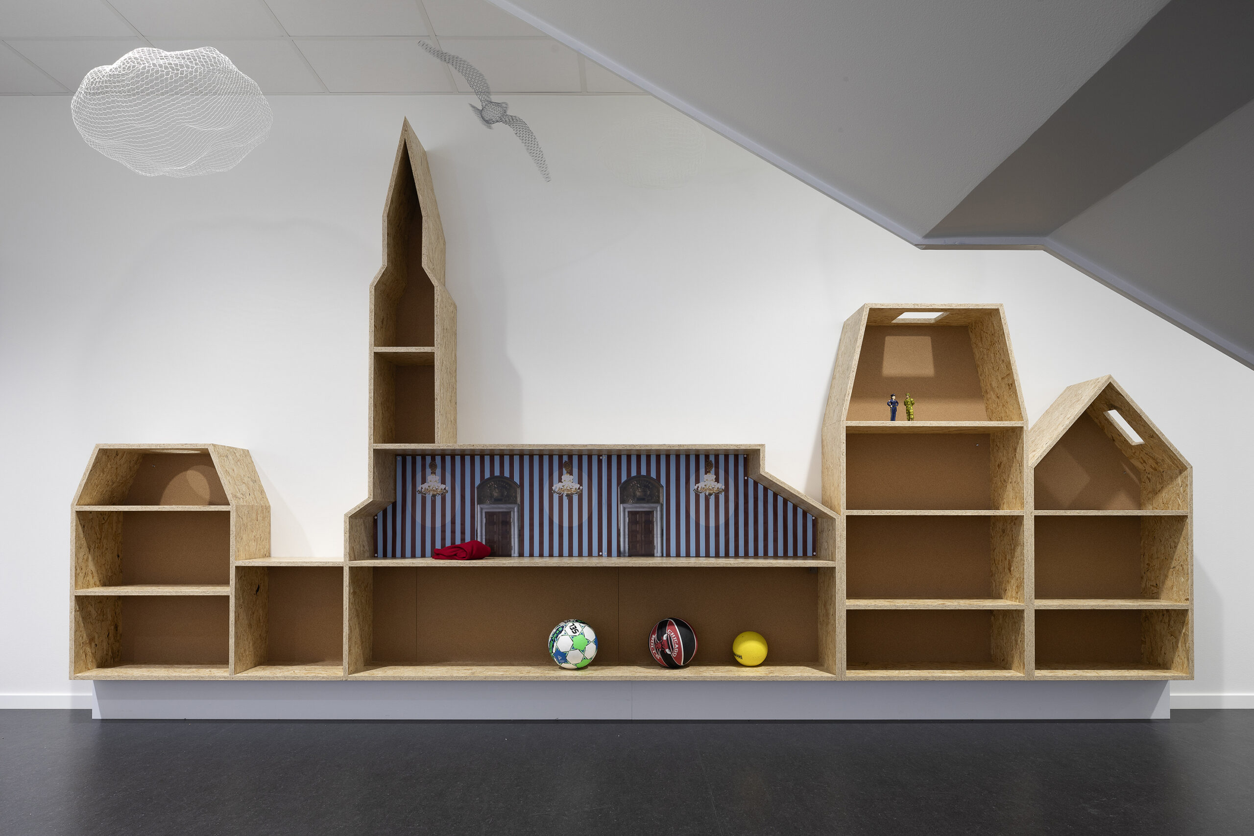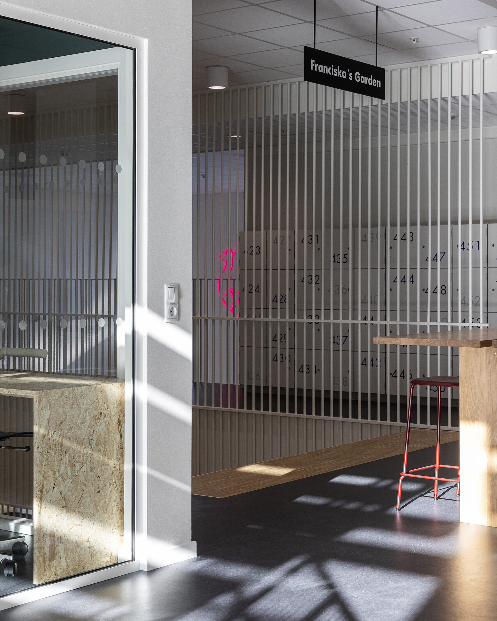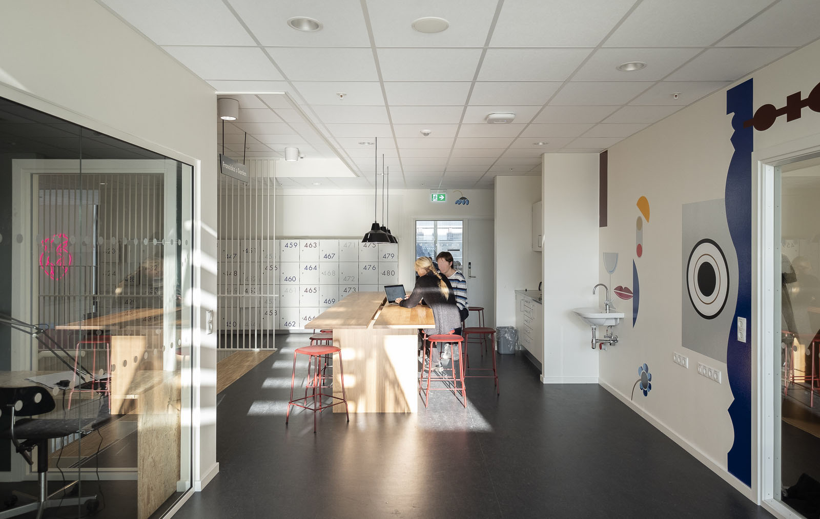 - lockers er omdannet til træbeklædte figurer, der skaber små gruppezoner