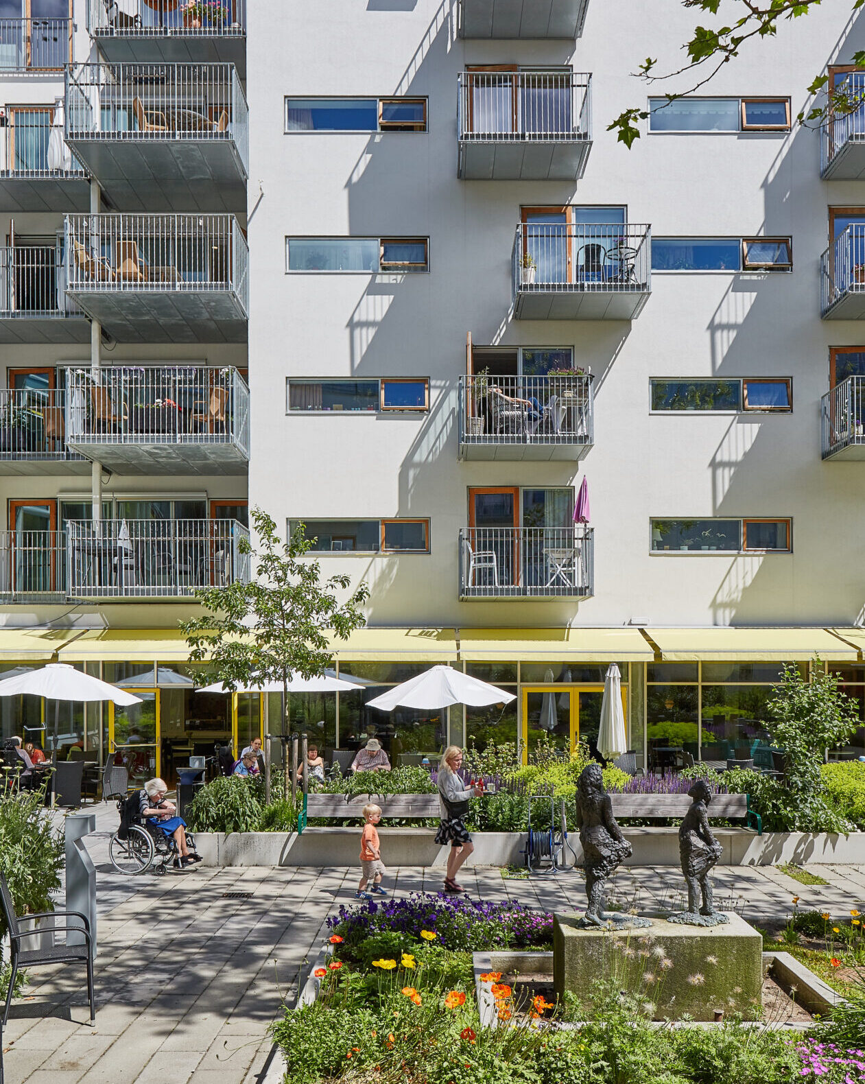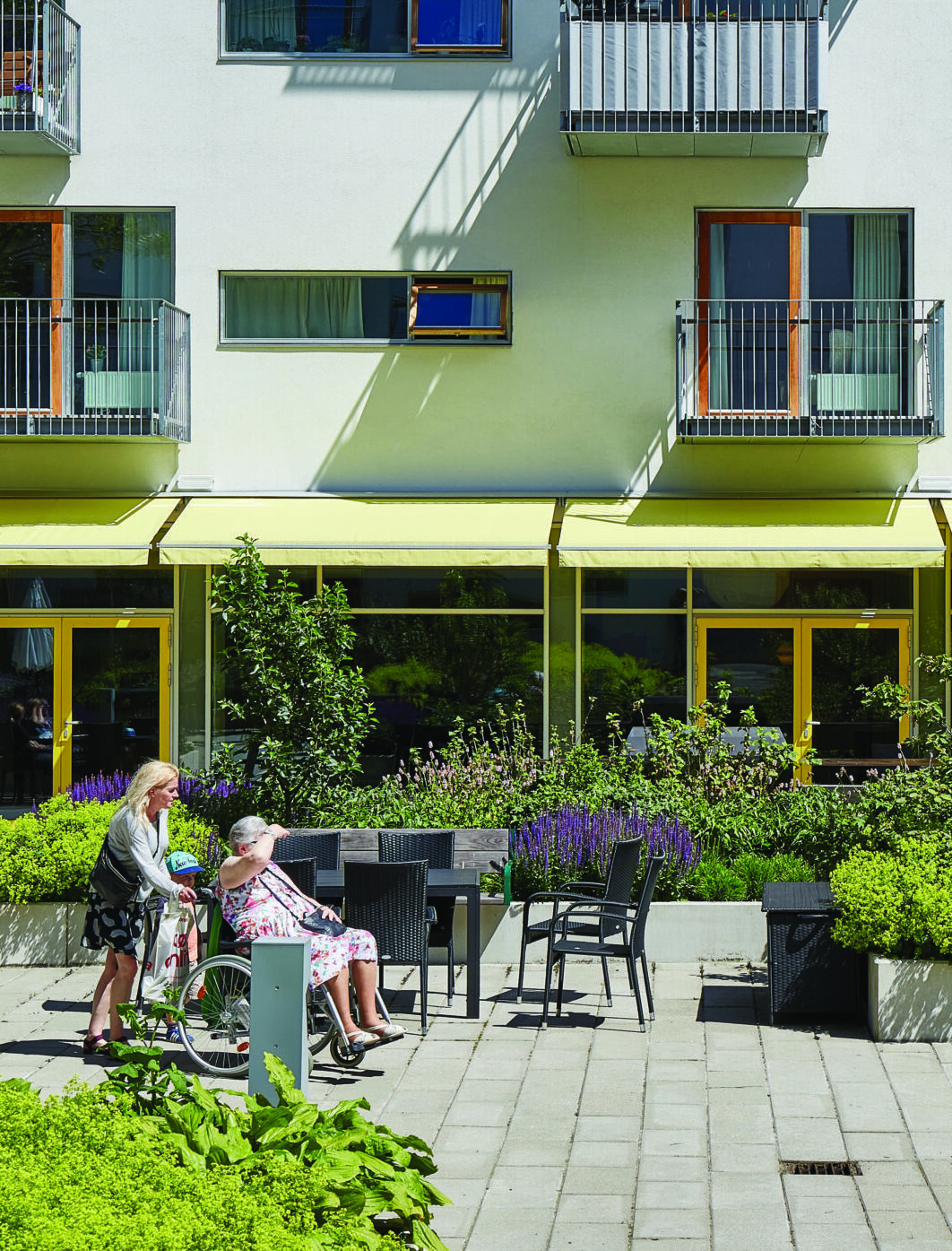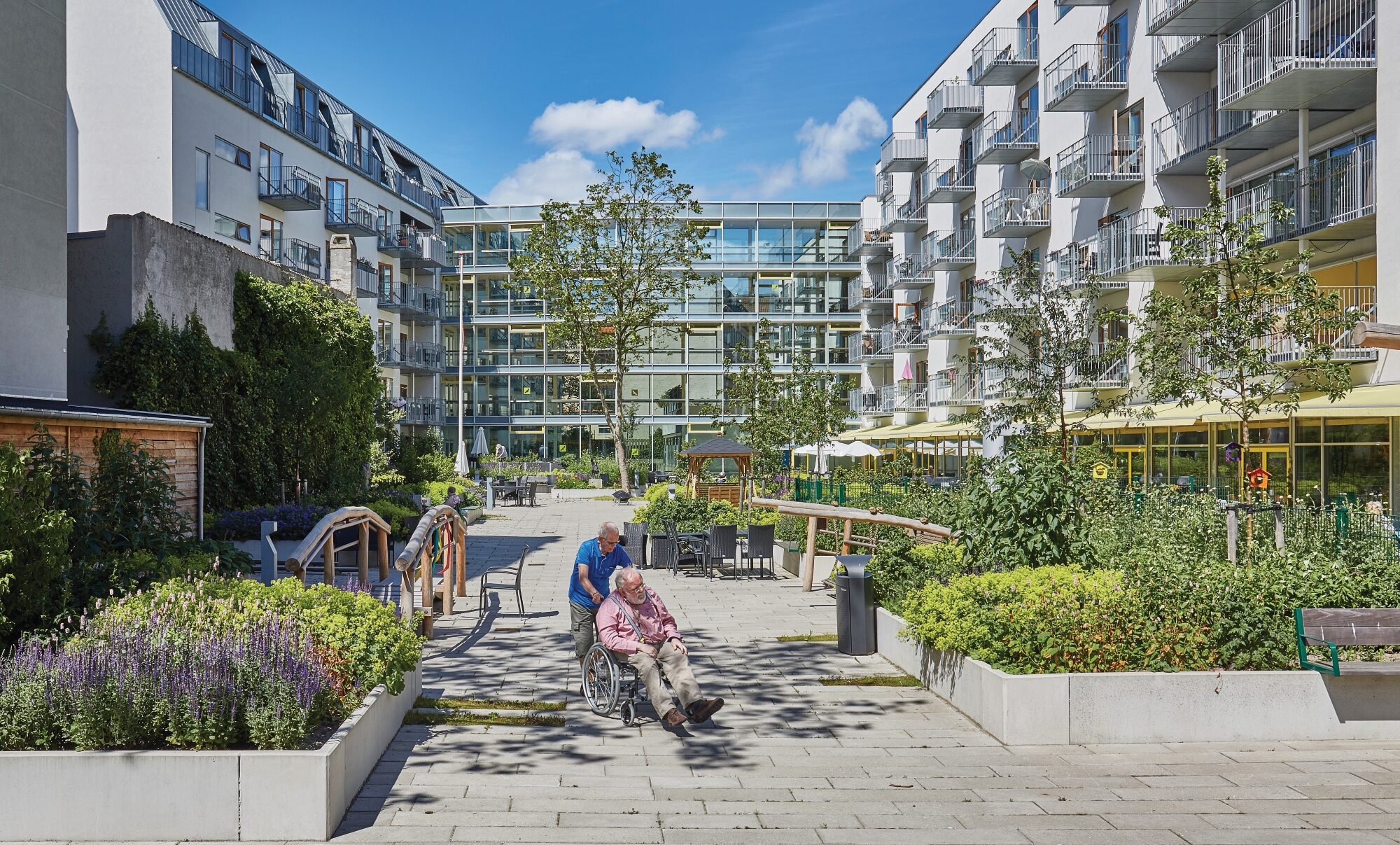 Omsorgscentret er indrettet med fokus på menneskelig skala og sanselighed. Farver, lys og materialer er nøje udvalgt for at skabe tryghed og genkendelighed – særligt for beboere med kognitiv svækkelse. Udearealerne er planlagt med terapeutiske elementer som sollys, sansestimulation og aktivitet, og alle boliger er tilgængelige og indrettet med omtanke for hverdagslivets behov.