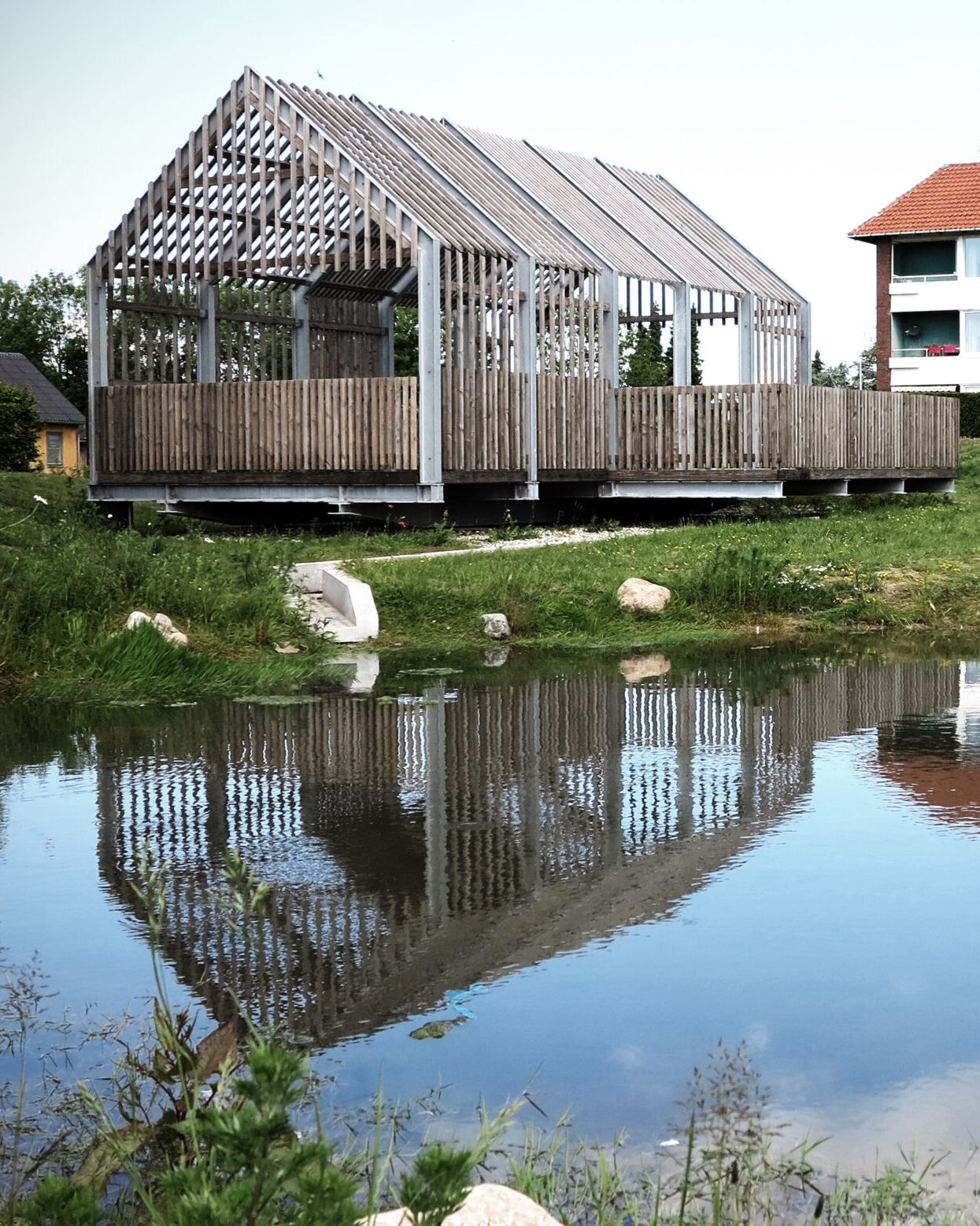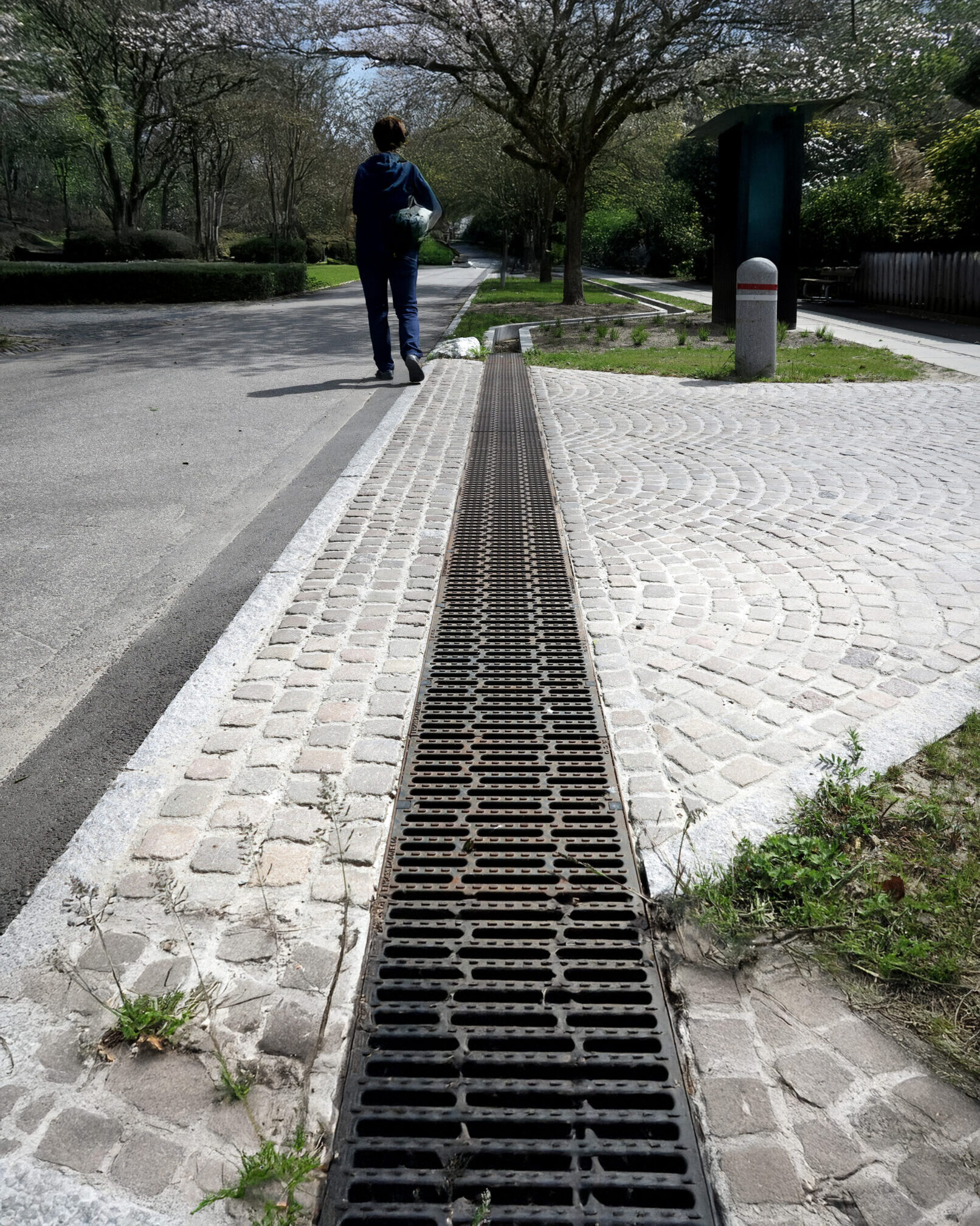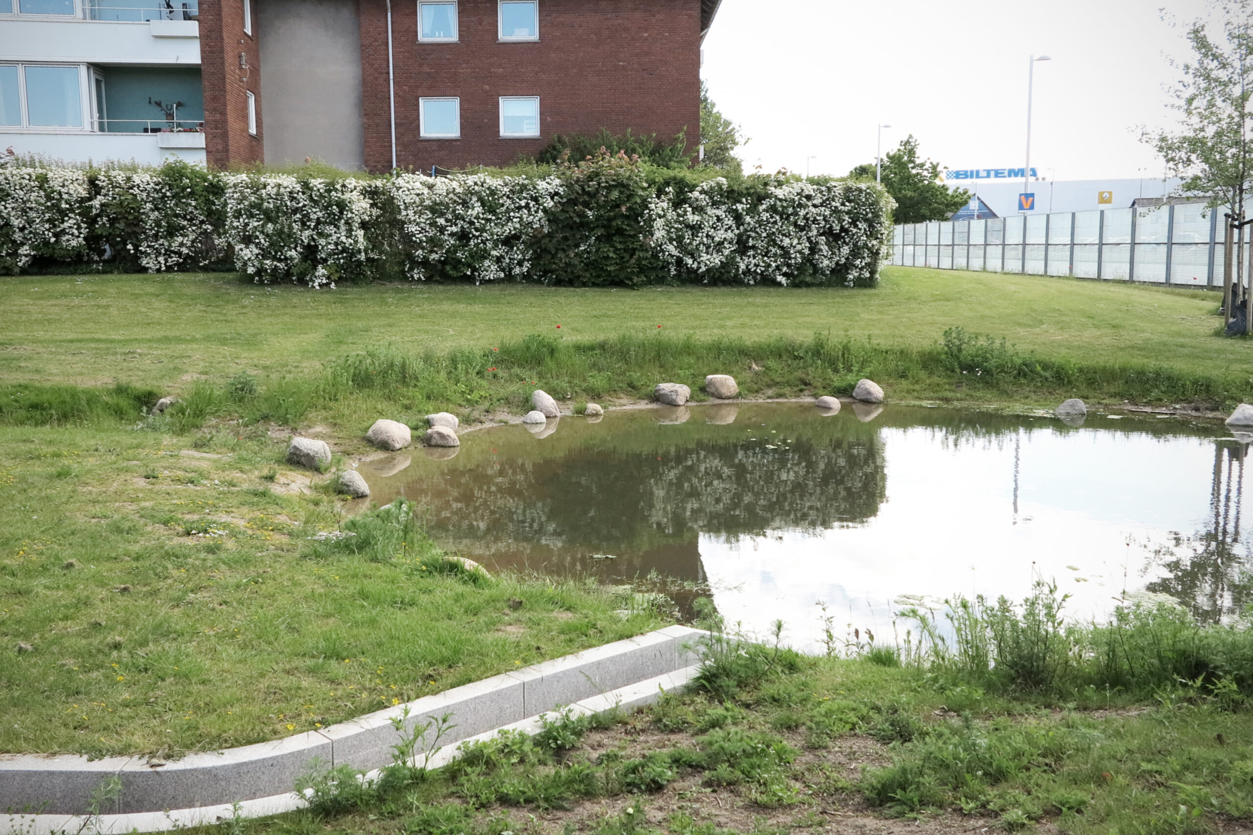 Løsningen bygger på et samspil af LAR‑elementer, der gør vandets kredsløb synligt i terrænet. Tag- og terrænvand opsamles i bassiner og render, forsinkes, fordamper eller nedsiver i de nye grønne udearealer. Resultatet er ikke blot en effektiv sikring mod oversvømmede kældre – det er også et frodigt, varieret landskab, hvor vandet skaber nye sanseoplevelser året rundt og understøtter en markant øget biodiversitet.
