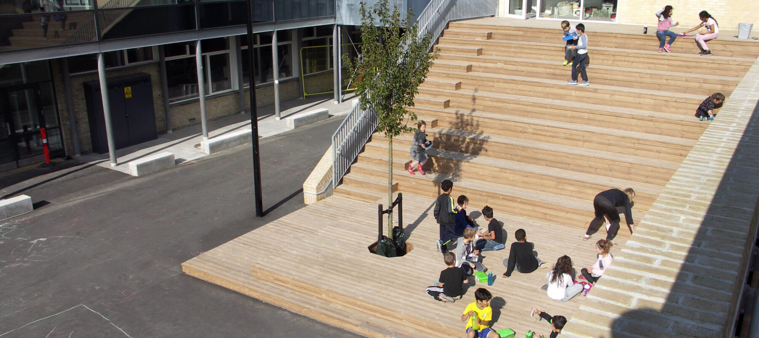 Udvidelsen er skabt med respekt for skolens oprindelige arkitektur. Nye bygninger i gule mursten viderefører det klassiske udtryk, mens musikhuset i Cortenstål tilfører en nutidig kontrast. Indretningen er fleksibel og inviterer til variation: siddetrapper til undervisning og leg, tagterrasser som læringsrum og nicher til fordybelse. Her mødes tradition og innovation i en arkitektur, der understøtter moderne læringsprincipper.