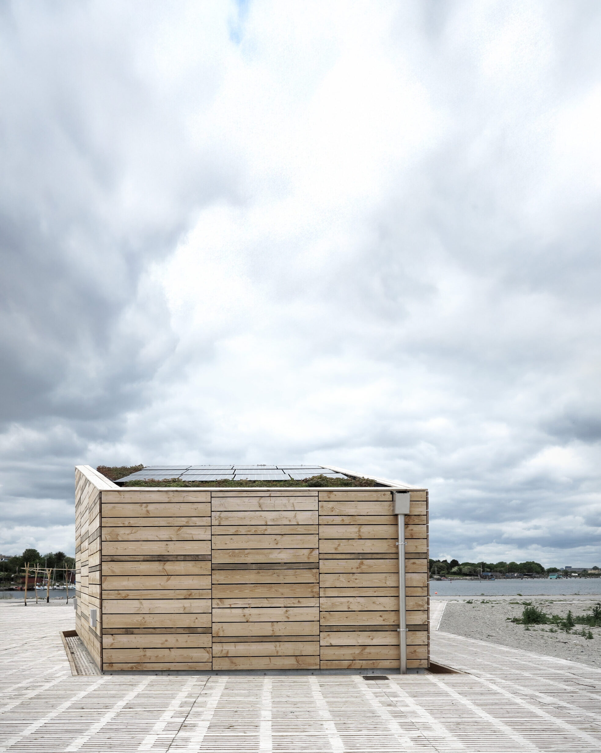 Vi har valgt materialer, der taler samme sprog som omgivelserne. Bygningerne er opført i ubehandlet douglasgran, som med tiden får en smuk sølvgrå patina. Porte og skodder er integreret i facaderne og skaber en åbenhed, der gør, at man kan se ind – selv når bygningerne er lukket.