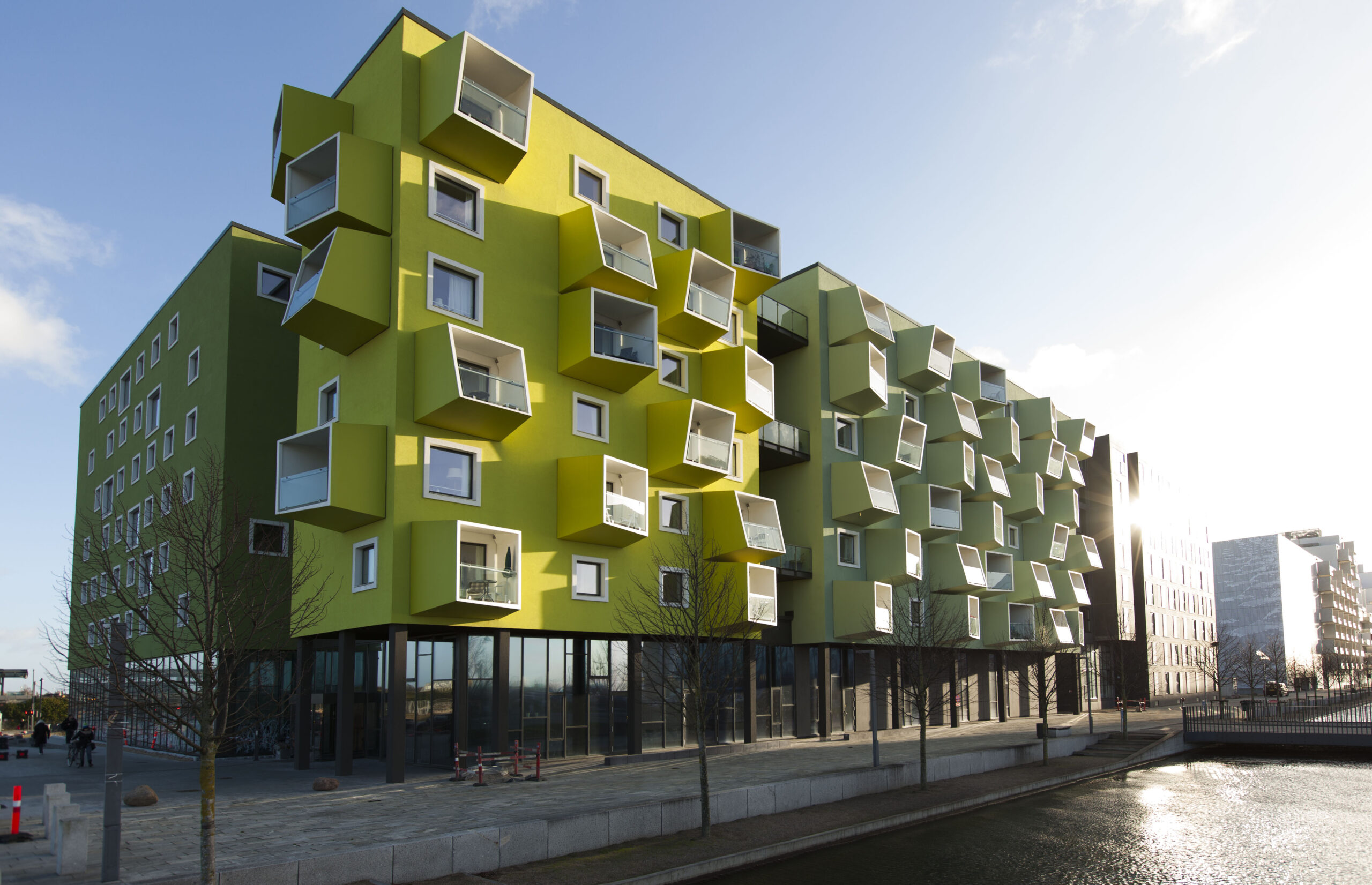 Med sine farvede facader i gule og grønne nuancer og markante balkoner med skæve snit har plejecentret fået en ikonisk og genkendelig identitet i bydelen. Arkitekturen kombinerer tætte bymæssige rammer med et stort grønt gårdrum, hvor ophold, bevægelse og udeliv finder naturligt sted.